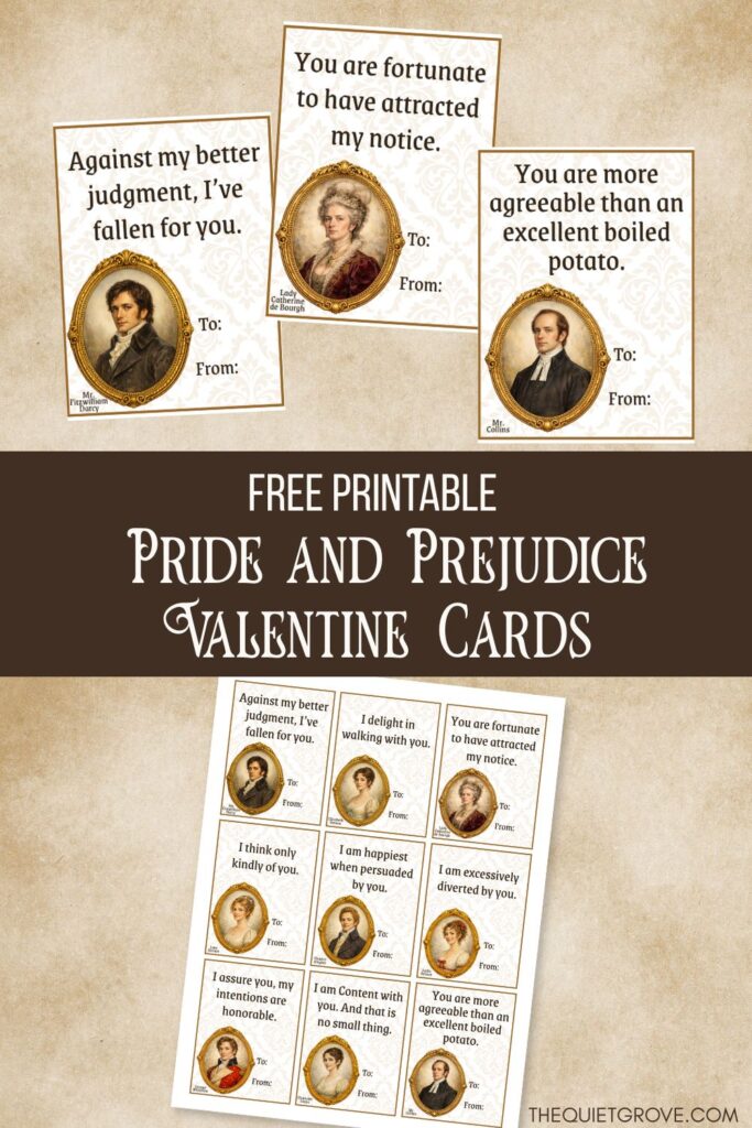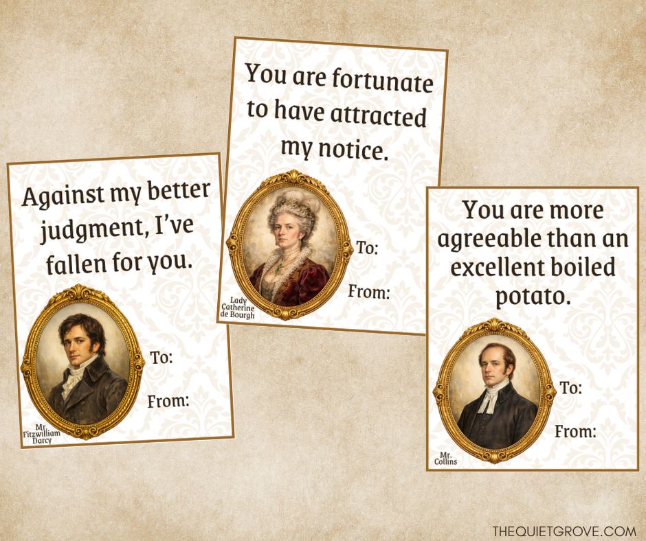 I am a lifelong Jane Austen fan, and Pride and Prejudice has always held a special place in my heart. I love the novel, adore the film adaptations, and have an especially soft spot for the 1995 BBC version (honestly, it’s perfection). Last year’s celebration of Jane Austen’s 250th anniversary really sparked my creativity and inspired several Austen-themed projects here on the blog—like my Free Printable Elizabeth Bennet Paper Doll and the Which Pride and Prejudice Lady Are You? quiz. I even dipped into designing Jane Austen–inspired merchandise for my Etsy shop. Once I started, I just couldn’t bring myself to stop… which brings us to these Valentines.